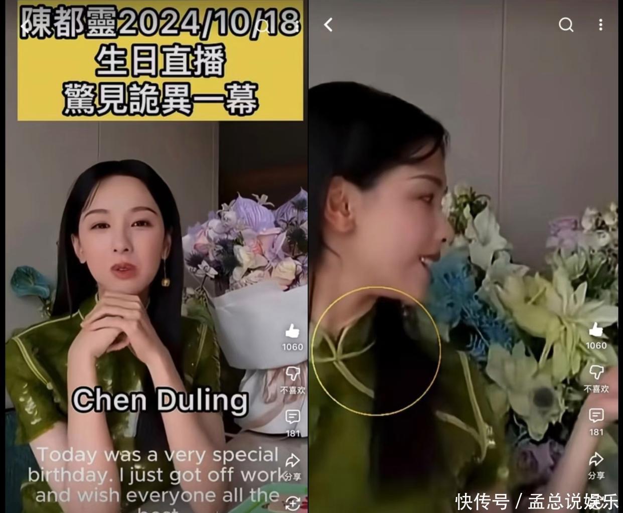 另一位当红女演员,清纯系小花陈都灵也面临着网友的质疑。在一段陈都灵的生日直播里,她身穿绿色亮片旗袍,娇美如花,她愉快地的和粉丝朋友分享过生日的激动心情。被细心的网友发现,在一转头的瞬间,陈都灵脖子上的皮出现了一道褶皱。